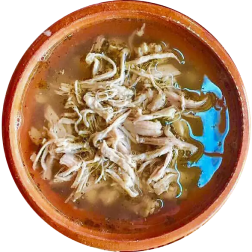 Sopa con granos de maíz cacahuacintle y carne de puerco o pollo, acompañado de lechuga, chile, cebolla, limón y orégano. ¡Si lo ves, no dudes en probarlo!.